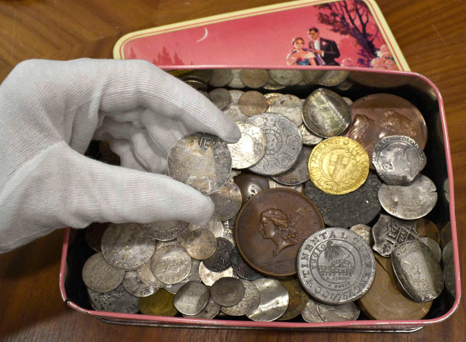 01-2.TinfulOfOldCoinsIncludingRareNewEnglandShilling(BeingHeld)MortonAndEden
